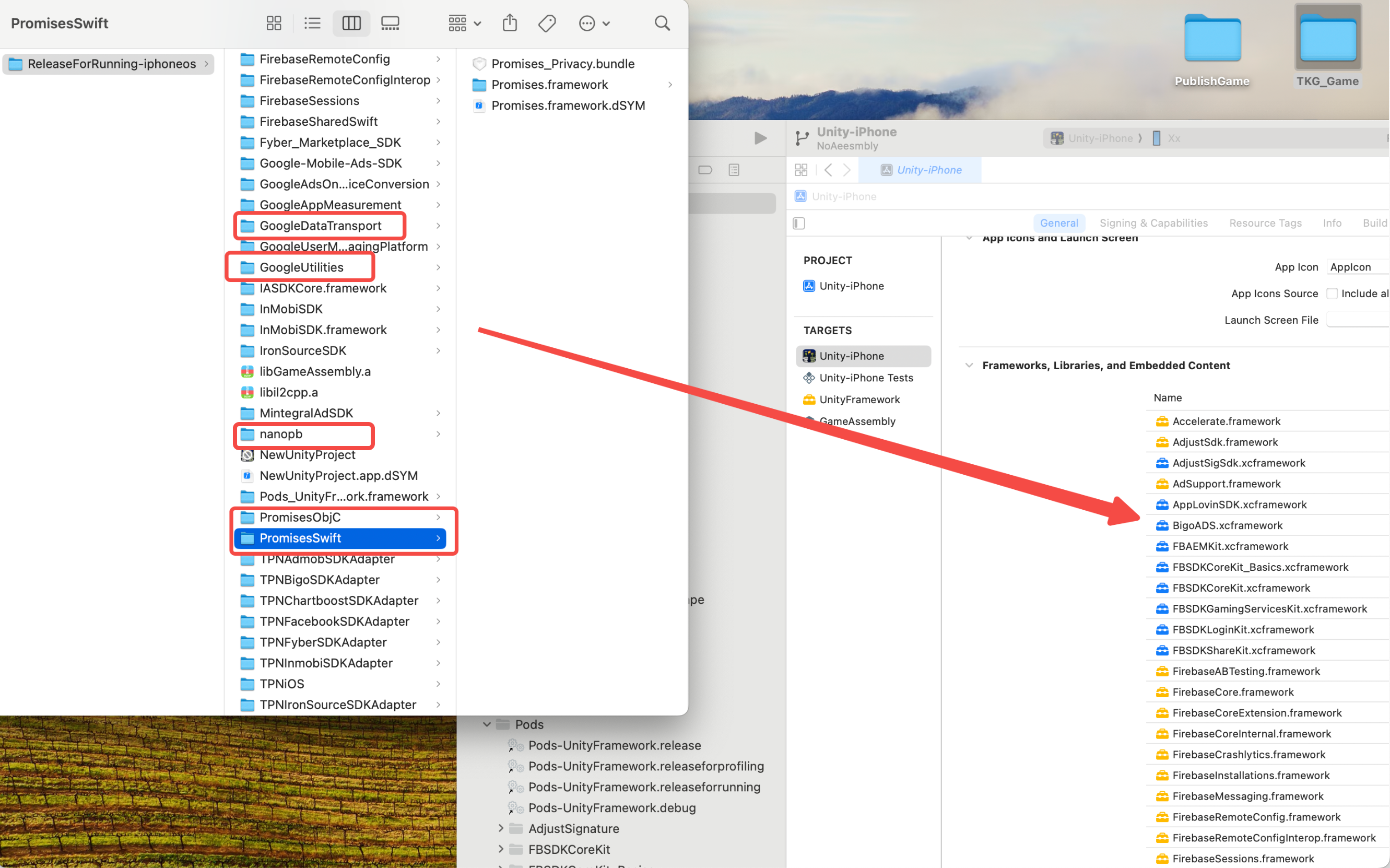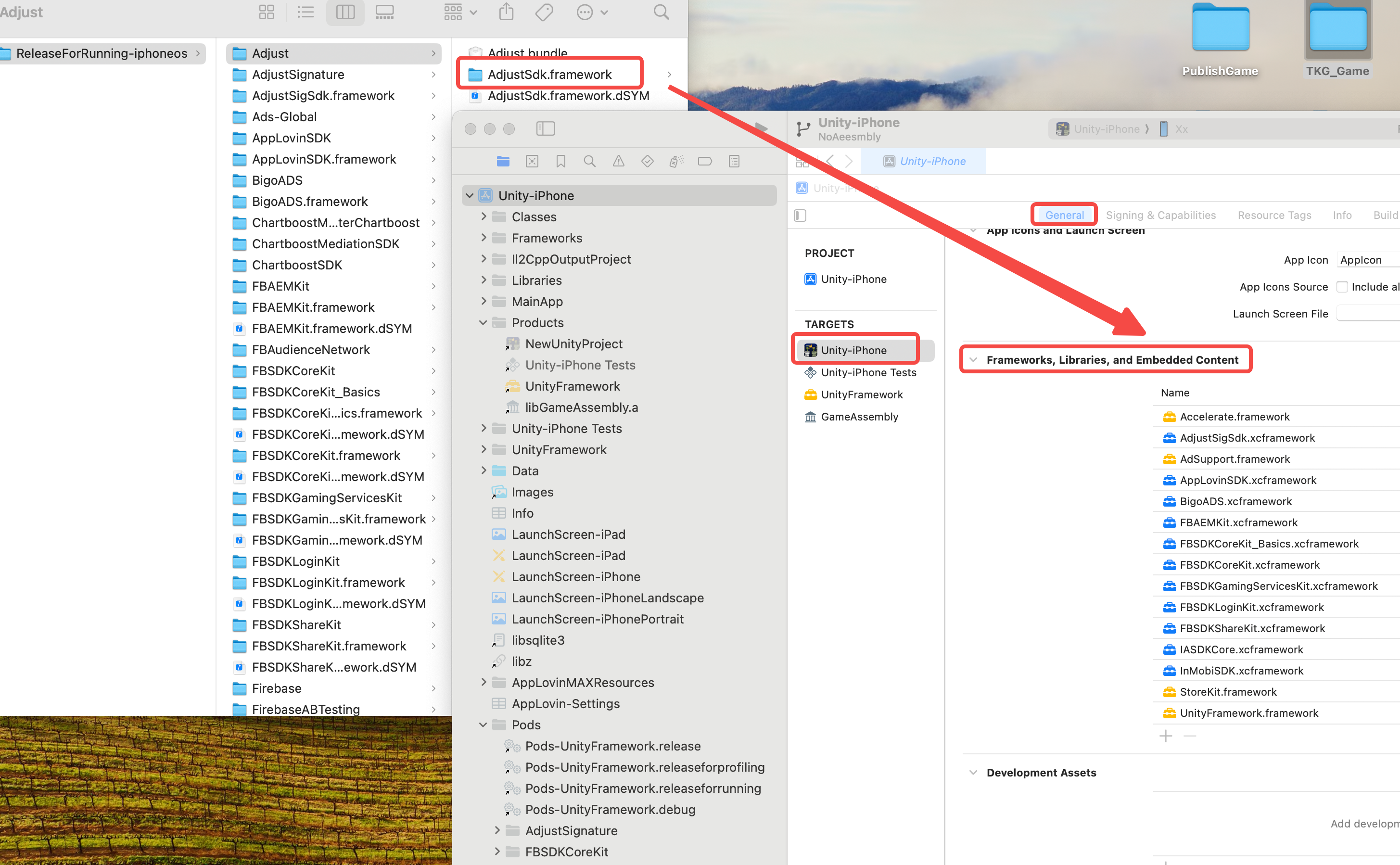 2.2 Drag the framework shown in the figure below to Unity-iPhone -> General ->Frameworks, Libraries, and Embedded Content in the TARGET directory as shown in the figure below: